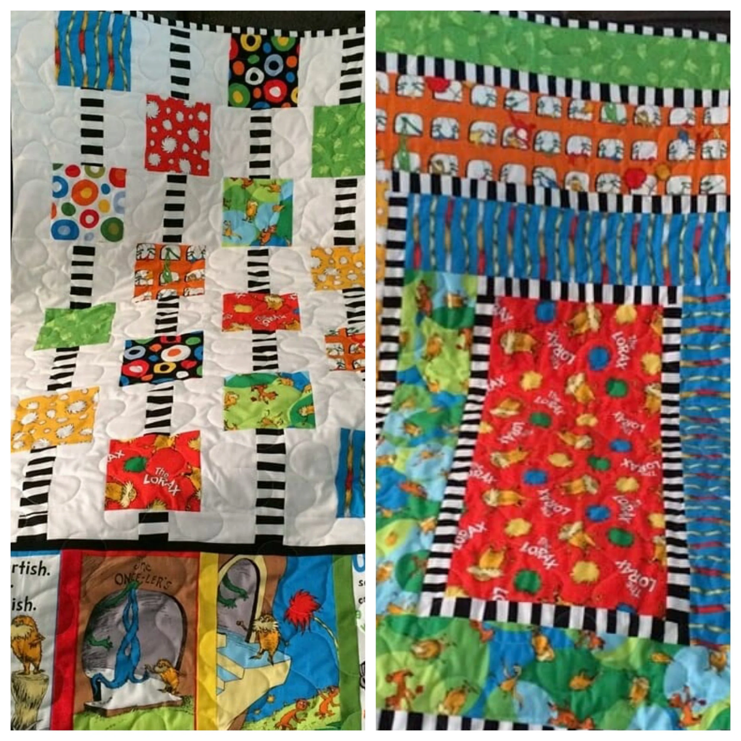 The quilter who made this quilt gives Dr Seuss books along with the quilt to the new baby.